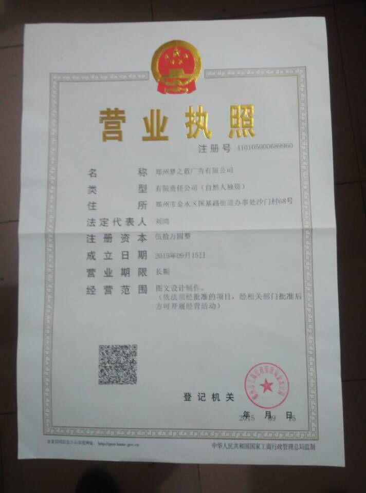 郑州梦之蓝广告有限公司诞生于2015年9月15日,刚开始就面临着没经验,没资金,没技术,没合伙人等一系列考验。当时的我屡次找工作失败而又面临着失业的压力,我环顾四周,看到那些自主创业的人,他们自己给自己上班,有明确的目标,给自己施以压力,学到东西是自己的,得到回报也是自己的,自己对自己问心无悔。看到这些,我对自己说“我要自己干”“我要闯出一番事业” “不管成功与否至少我学到了东西,对得起自己”就这样,凭着自己的一腔热血,独自注册了郑州梦之蓝广告有限公司,从此,对自己有了新的目标。对中国当前广告业发展有了新的认识: